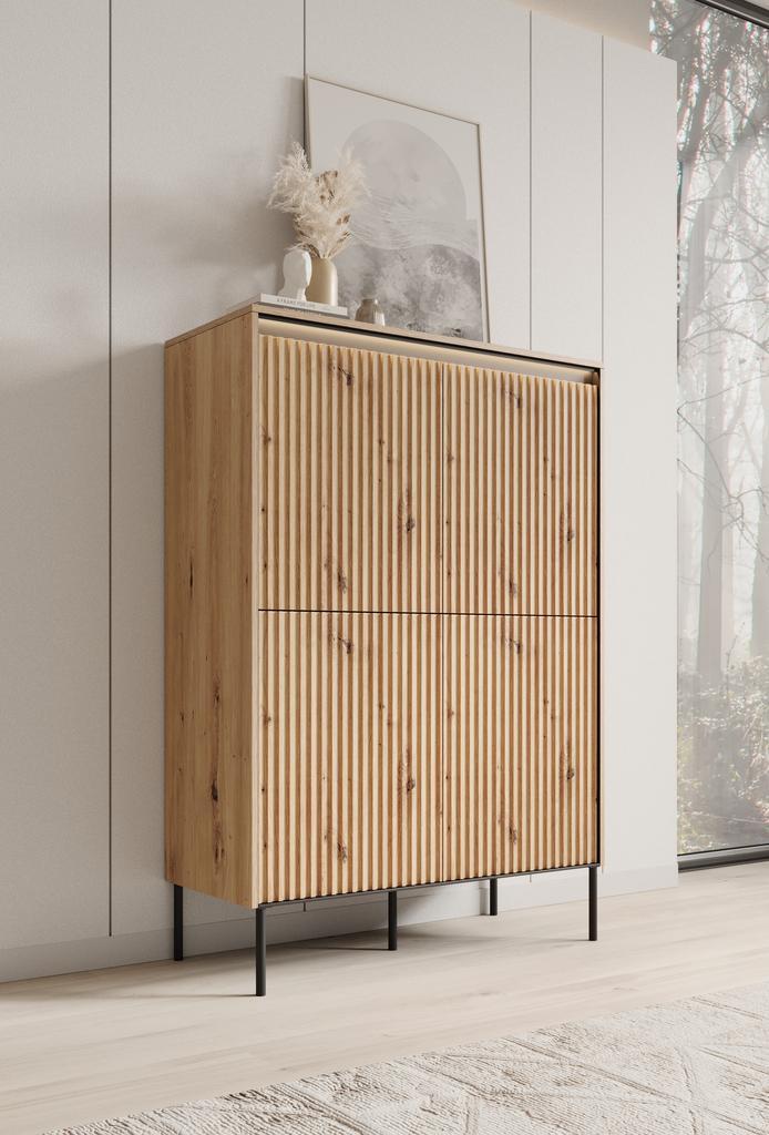 Dressoir Timoteo is gemaakt in een eiken kleur. De opbergkast beschikt over 4 greeploze deuren. Deze openen via een push-to-open systeem. Achter de deuren zitten 8 opbergvakken. Het dressoir staat op zwarte, hoge pootjes.