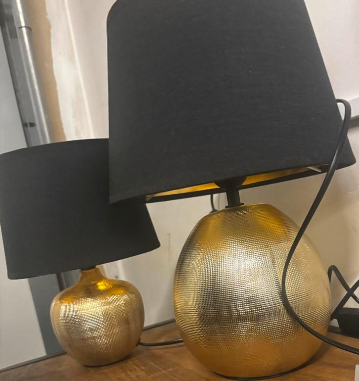 Set van twee goudkleurige lampjes. Deze lampjes zorgen voor een warme en sfeervolle verlichting in elke kamer. Perfect voor op een nachtkastje, dressoir of bureau. De lampen zijn in goede staat en klaar voor gebruik.