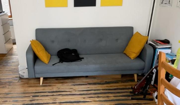 Ik geef mijn 4-zitsslaapbank „BROADWAY” (zeegroen) van Maisons du Monde weg. Het kan worden omgevormd tot een bed dankzij een klik-klaksysteem. Het is functioneel, maar heeft enkele zichtbare vlekken (zie foto's). Op