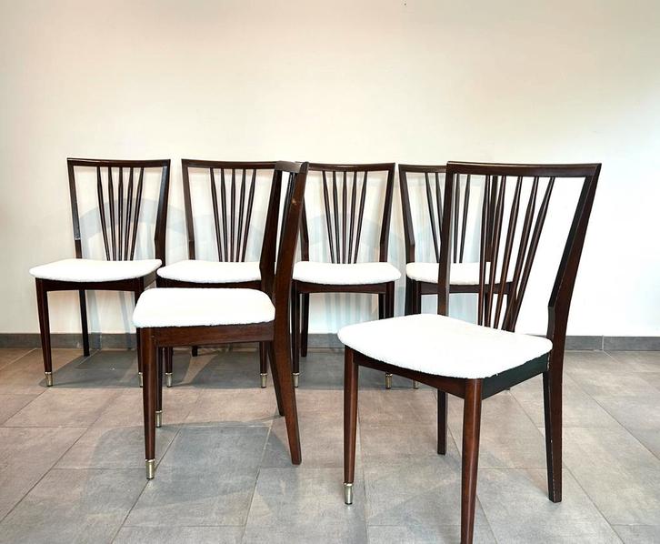 6 donker houten vintage stoelen met witte bouclé bekleding. Houtwerk heeft wat sporen van gebruik en destijds houtworm in gezeten en heeft gaatjes achtergelaten bij sommige stoelen( zie foto’s) prijs voor 6 samen