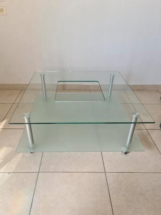Mooie vierkante salontafel in glas met metalen poten en dubbel plateau. Stevig, makkelijk schoon te maken en past in elk interieur. Wieltjes vanonder om hem makkelijk te verplaatsen.