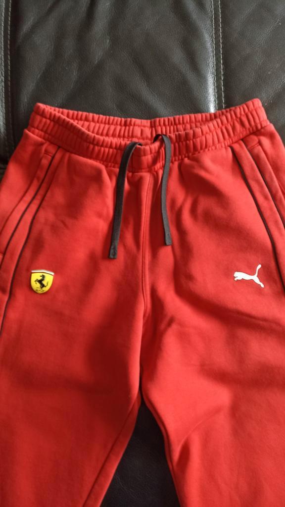 De broek is voorzien van een elastische band + aantrekkoordjes. De broek heeft afsluitbare zakken, voorzien met een rits. Aan de binnenkant warm en zacht gevoerd. Embleem van Ferrari en Puma op de bovenbenen. De broekspijpen, knieën, de gehele broek is in nette/ongeschonden staat.