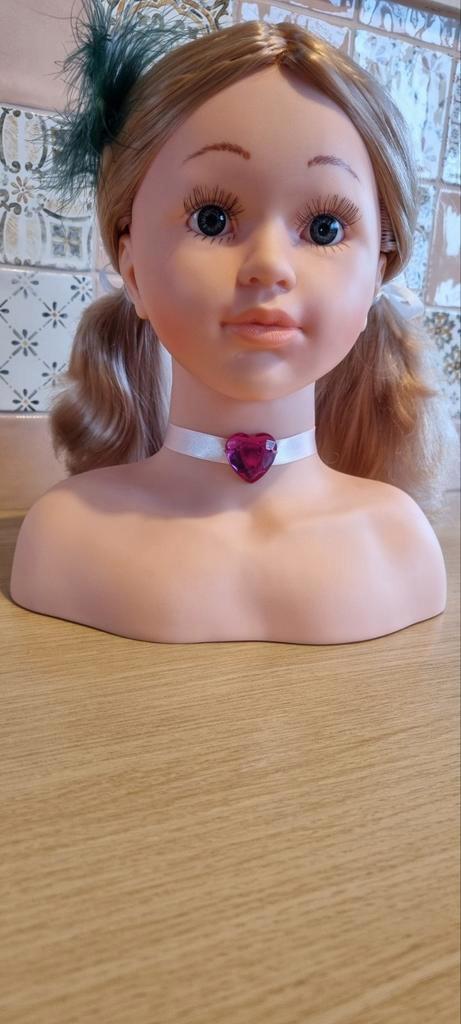 Inbegrepen accessoires: borsteltje, hartenketting, witte strikjes en groene veer in de haren.