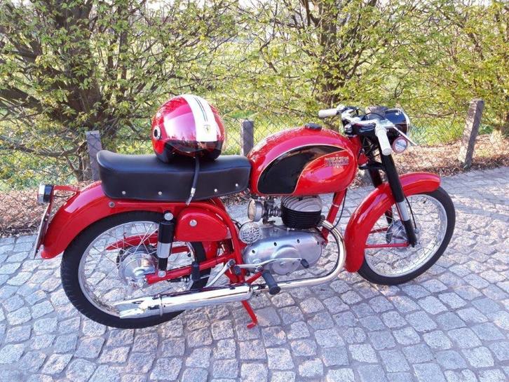 Exceptionele Bianchi 125 Mendola uit 1958. Deze Bianchi verbleef 58 jaar bij dezelfde eigenaar. Hij was in gebruikt tot 1970, de laatste taxbon in de houder hiervoor is nog aanwezig op de moto. Daarna stond de Bianchi vele jaren opzij in de stal tot hij er in 2010 werd buitengehaald, om te worden gerestaureerd door de eigenaar en zijn zoon met behulp van een ex-werknemer van Moto Bianchi. Deze restauratie werd uitgevoerd op hoog niveau en volledig periodiek correct, zo werd bijvoorbeeld de goudkleurige striping op de benzinetank tussen de rode en zwarte lak, zolas het hoort met de hand geschilderd. De Bianchi heeft nog steeds zijn originele bougiesleutel, handleiding en onderdelencataloog. Ook het originele italiaanse registratieboekje en andere oude documenten zijn erbij. Sinds 2019 is de Bianchi ingeschreven op belgische papieren. Kortom een zeer mooi en gedocumenteerd verzamelobject, kan zowel van genoten worden om mee te rijden of als collectie of decoratie. Prijs bespreekbaar bij de moto.