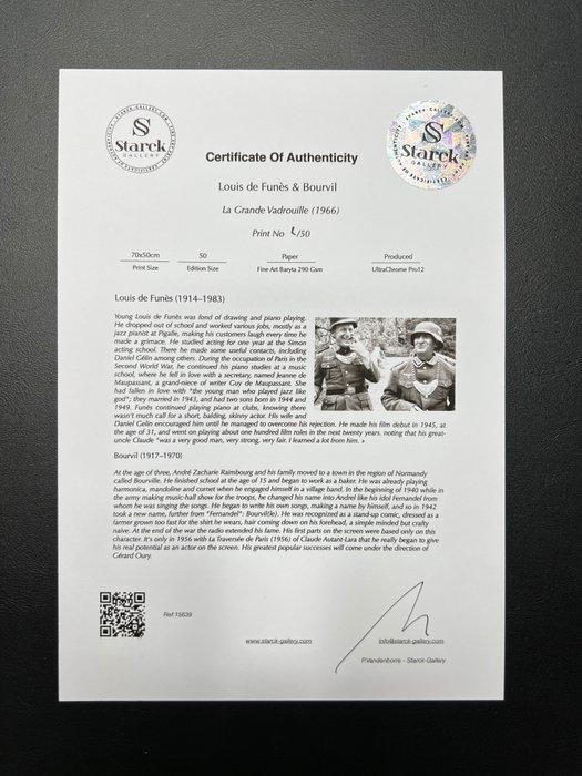Kunstfoto uit Louis de Funès & Bourvil La Grande Vadrouille (1966), met handtekening en ingelijst in een luxe houten lijst, gelimiteerde editie nr. 06 van 50 met certificaat.