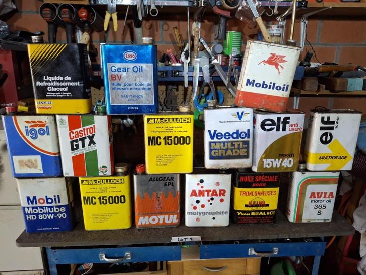 Mooie Partij oude olieblikken Partij bestaat uit 15st.Kunnen nog wel een poetsbeurtje gebruiken of zo neerzetten met de huidige patina is ook heel mooi. Mooi als decoratie in je brommerschuur of bij je oldtimers. 99euro afgehaald.Opsturen kan natuurlijk ook.Vraag daarvoor ff naar de verzendkosten.