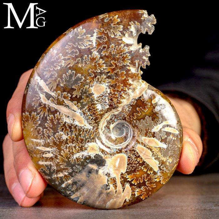 De ammoniet Cleoniceras is een weekdier dat leefde tijdens het late Krijt, ongeveer 100 tot 65 miljoen jaar geleden. Deze fossiele schelp heeft een uitgesproken spiraal en een afgeplatte middelste deel, gekenmerkt door bladachtige junctielijnen. De mond is goed bewaard gebleven en de kleur varieert van lichtbruin tot donkerbruin met oranje tinten, als gevolg van de aanwezigheid van aragoniet.De schelpen van Cleoniceras zijn een waardevolle hulpbron voor geologie- en evolutieonderzoekers, omdat ze informatie bieden over de biodiversiteit en de milieutoestanden van de aarde tijdens het Mesozoïcum. Dit unieke stuk is een belangrijke aanvulling voor elke collectie of als decoratief element in je huis of kantoor.